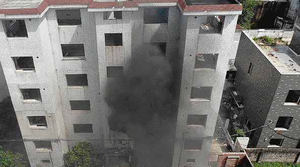 无人机热成像显示新国标电动自行车燃烧的高温区域覆盖了实验楼的一楼至三楼,比旧国标电动自行车少一层。