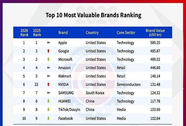 新版世界品牌500强排名发布:苹果谷歌微软包揽前三华为第8
