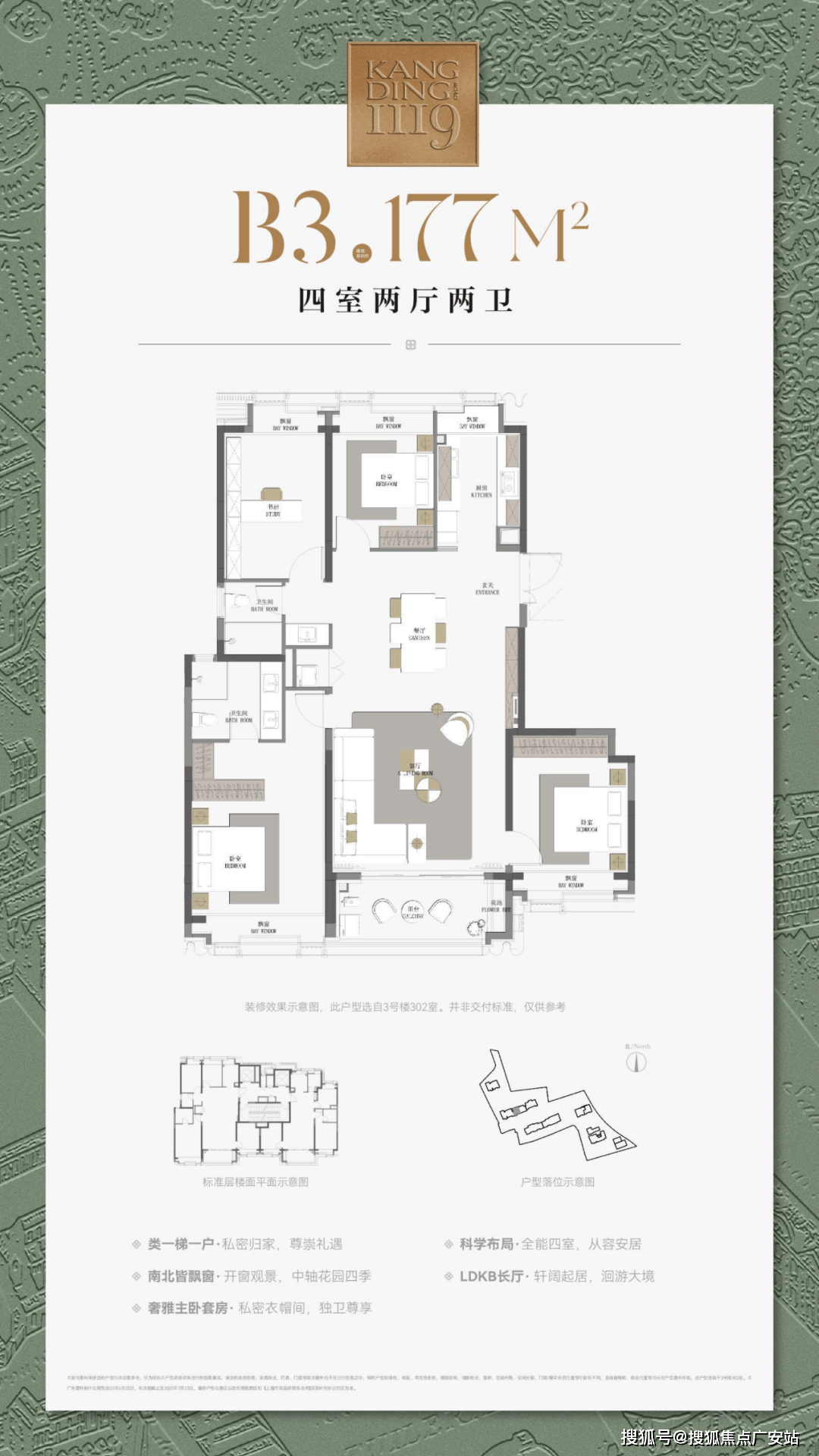 最重要的是,康定壹拾玖这建面约177㎡4房不仅仅是方正,更是飞机户型,三开间朝南+南北通透+无走道的浪费,整个户型相当正气。