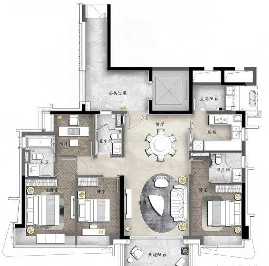 【B户型】约200㎡一线临江环幕大宅,一线°环幕三江视野,独立电梯入户,多功能入户花园,简约半开放式厨房,美味品味兼得,阔绰双主套房设计,尊享舒奢起居,R9栋为开放式3+1房交付,客厅与书房打通,开间可拓展至7.2米