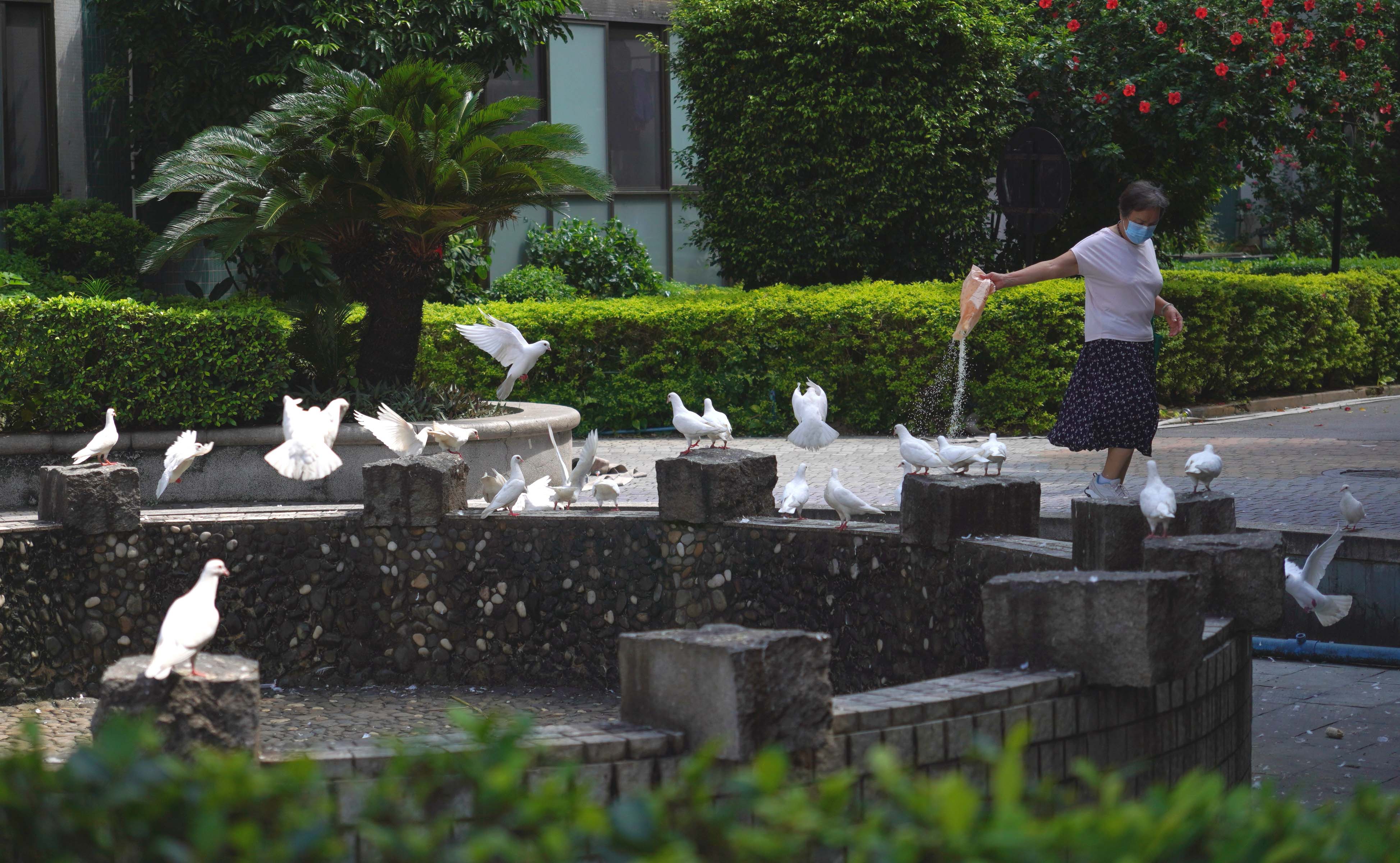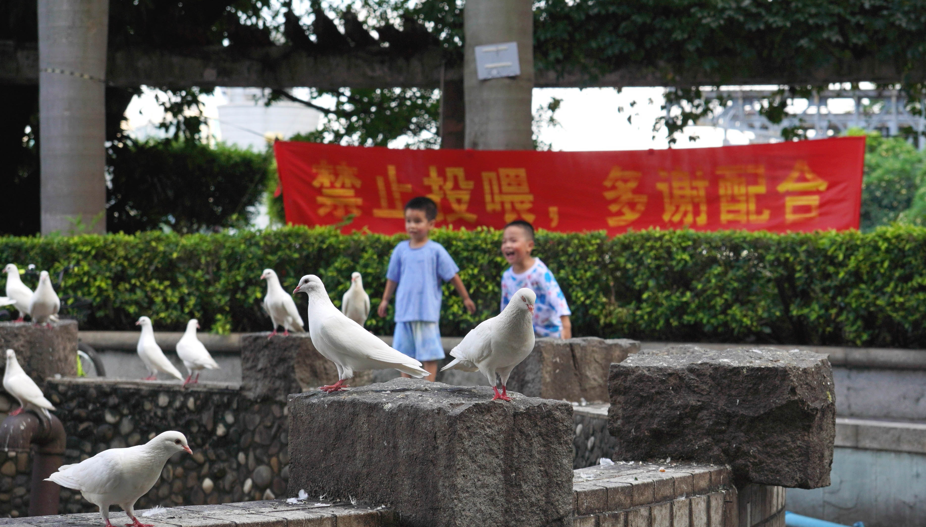 透过陈女士家粘上斑斑点点鸽粪的玻璃窗往外看,公共广场旁,两名儿童时而安静地看着啄食的白鸽,时而加入鸽群嬉戏,俨然一副其乐融融的景象。“孩子们很喜欢和鸽子玩,天气好的时候我们都会来这里散步看鸽子。”一位老居民向记者表示,“鸽粪和羽毛多加清理就好,鸽群是咱们小区一道美丽的风景线,我不赞成把它们清除掉。”