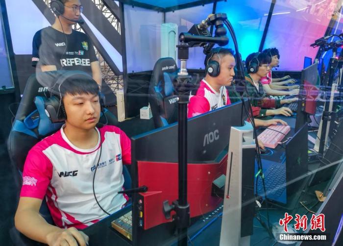 资料图:2019WUCG三亚电竞节在海南三亚半山半岛帆船港开幕,图为中国集美大学战队进行《英雄联盟》比赛。中新社记者 骆云飞 摄