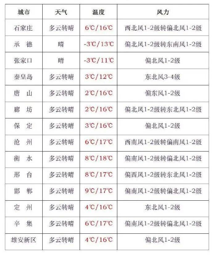 今天白天,保定、廊坊以南地区多云转晴,其他地区晴间多云。张家口北部、承德北部最高气温6℃至11℃,其他地区12℃至18℃。
