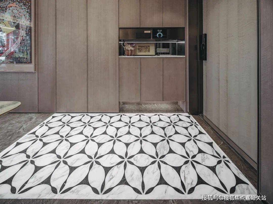 客厅电视背景墙夸张的选用了大面整块的梦幻臻玉岩板;餐客厅地面使用了900*1800mm的超大尺寸密缝岩板砖……各类高定艺术型材,于无声之中将艺术格调拉满。