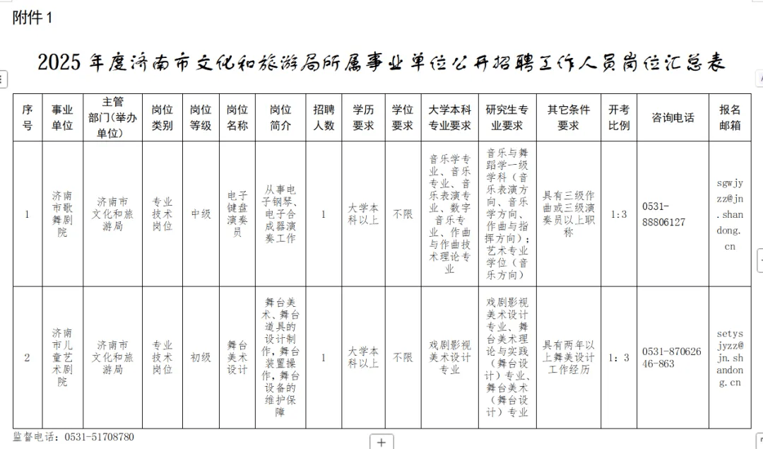 根据事业单位公开招聘有关规定,结合济南市文化和旅游局所属事业单位济南市歌舞剧院和济南市儿童艺术剧院岗位空缺情况和工作需要,现将2025年公开招聘工作人员简章公告如下:
