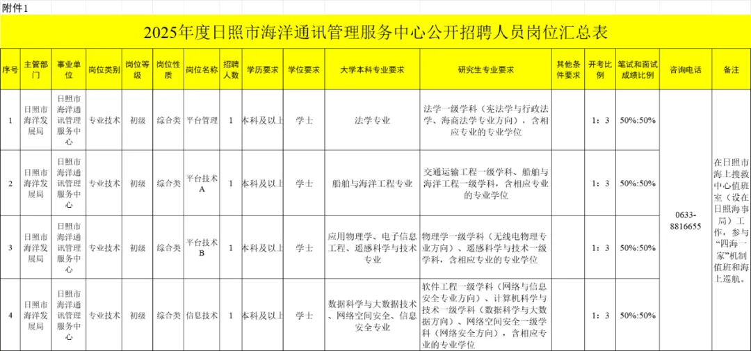 本次招聘专项用于服务保障日照市“四海一家”全时联勤机制、一站式解纷中心、港航交通组织一体化调度工作,具体工作岗位在日照市海上搜救中心值班室(设在日照海事局)。岗位条件、招聘人数等具体要求见《2025年度日照市海洋通讯管理服务中心公开招聘人员岗位汇总表》(附件1)。