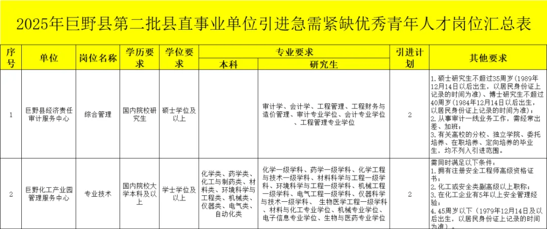 1.2025年巨野县第二批县直事业单位引进急需紧缺优秀青年人才岗位汇总表