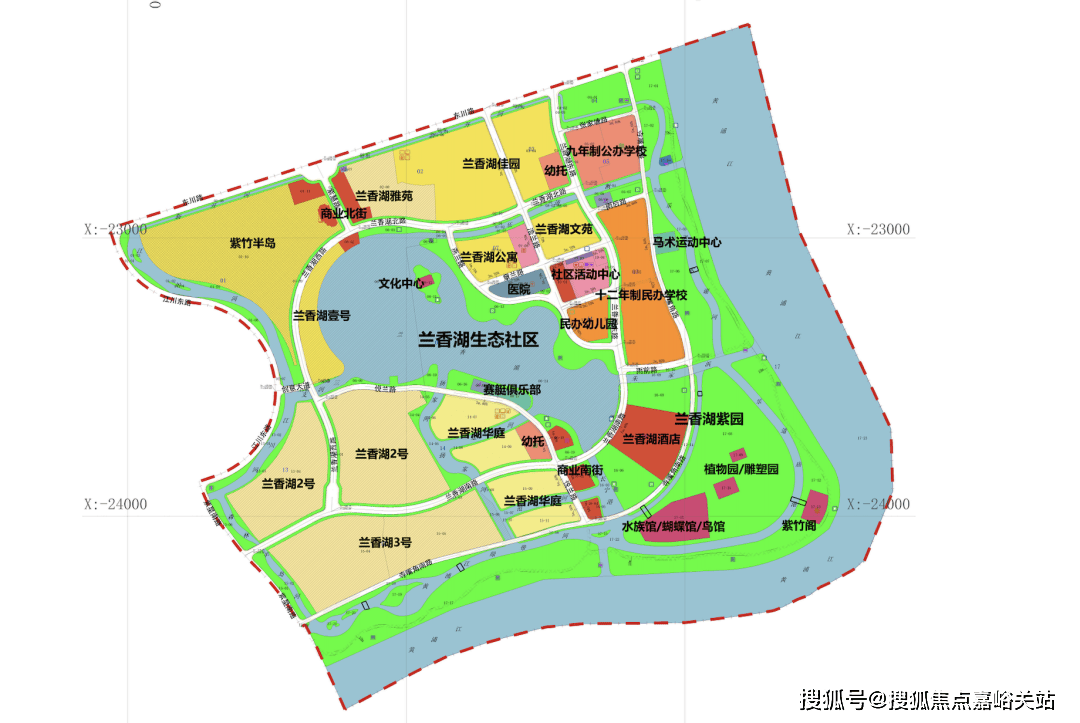 商业街、星月步道、文化艺术长廊、赛艇俱乐部、兰香湖亲子酒店和阳光乐园、青少年活动中心等十多个景观节点。